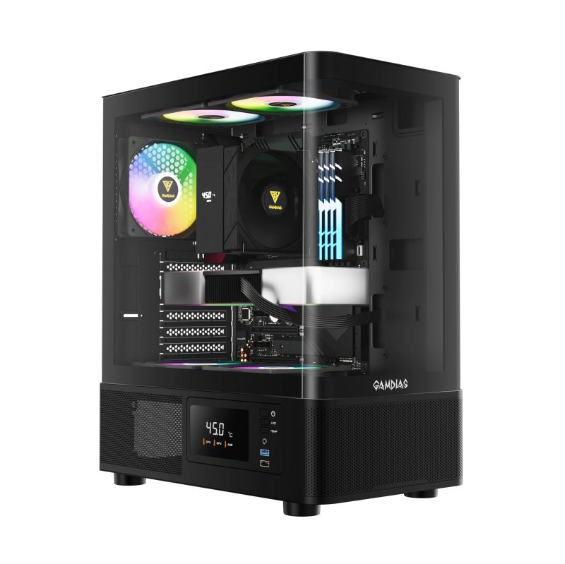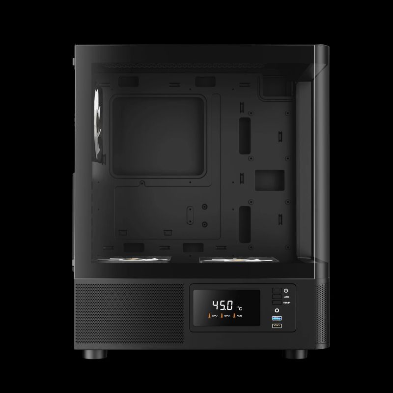 | ДОПЪЛНИТЕЛНИ | Seamless Curved Glass Display Perforated Air Vent PSU Chamber 3 Built-in 120mm ARGB Fans (2 x Reverse Intake Fans) Customized Monitor for System Information and Ambient Temperature Fits Mini-ITX, Micro-ATX, and ATX motherboards Magnetic Dust Filter Compatible with 340mm GPU |
