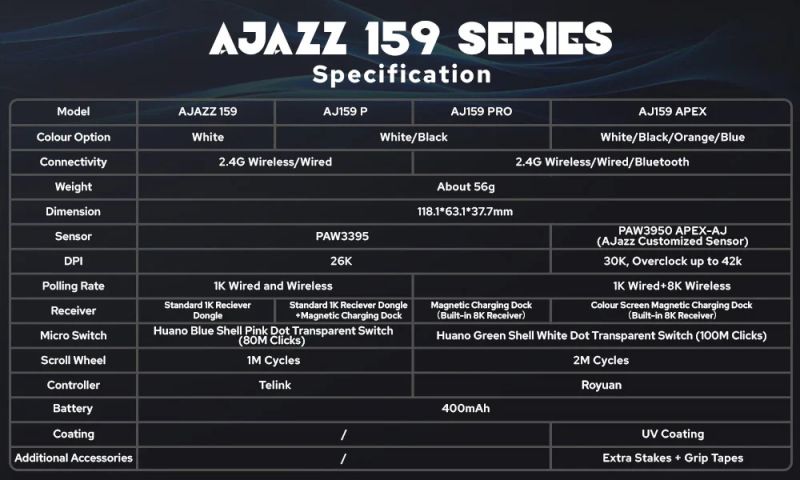 AJ159 APEX can be overclocked to 42,000 DPI, alongside a tracking speed of 750 IPS and 50G acceleration