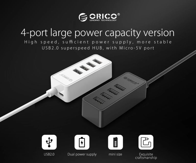Orico хъб USB2.0 HUB 4 port - USB/Micro USB input, Black - W5P-U2-030-BK-EP