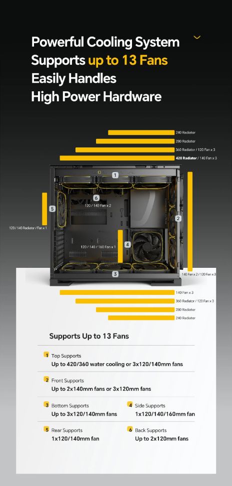 Supports up to 13 x 120mm fans