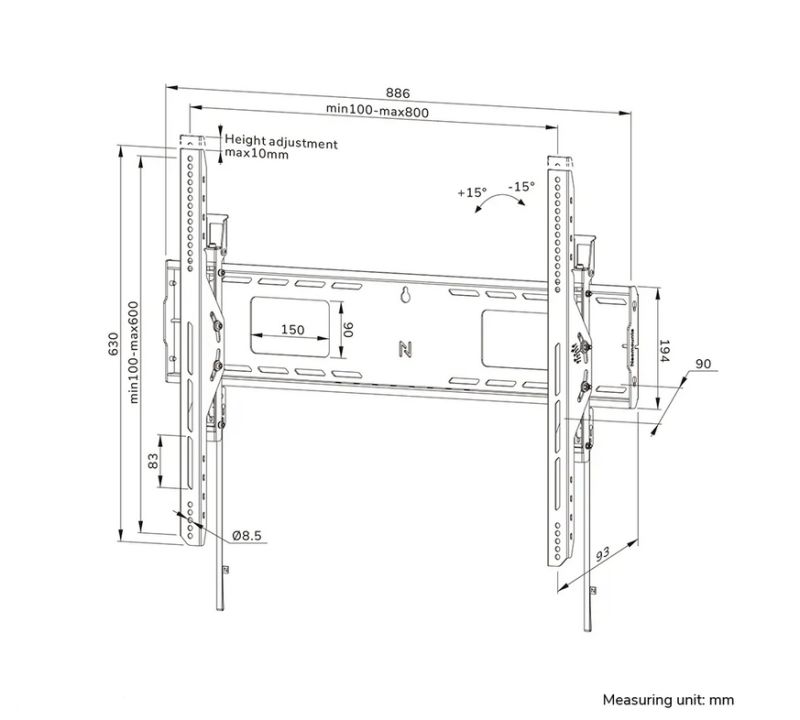 Height: 68.4 cm (adjustment: 1 cm), Width: 88.6 cm, Depth: 9.3 cm, Adjustment type: Manual