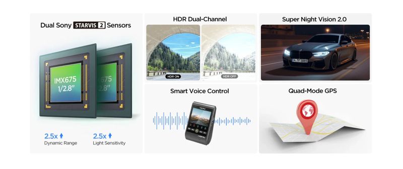 | ФУНКЦИИ | Dual 2K Recording HRD Dual-Channel Super Night Vision 2.0 Voice Control 5GHz Wi-Fi Ultra-Precise GPS Parking Mode Auto Event Detection Time Lapse Recording Low Bitrate Recording Loop Recording & Auto Emergency Lock |