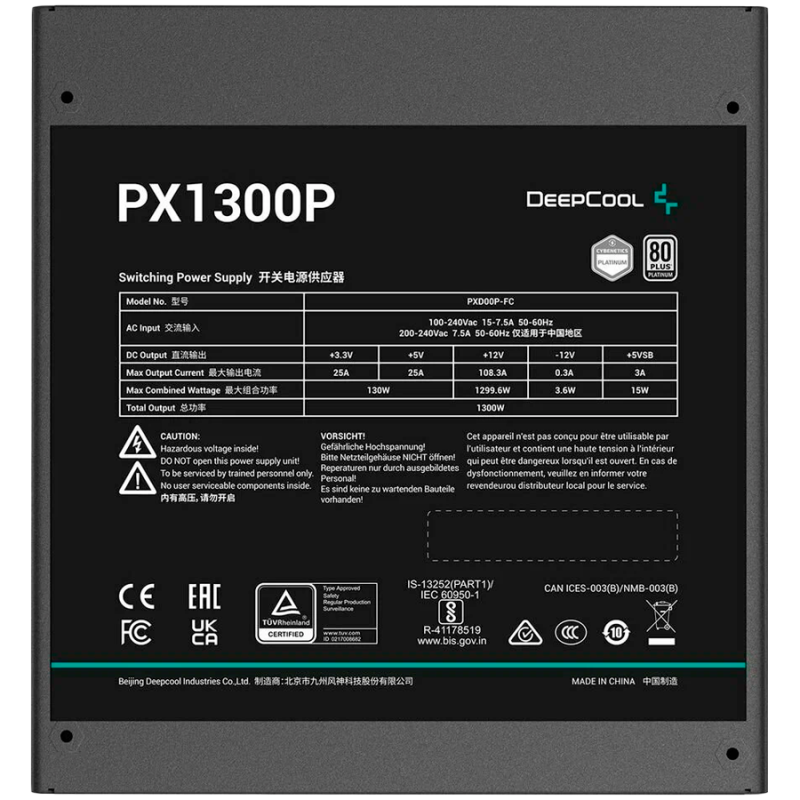 DeepCool PX1300-P, 1300W, 80 Plus PLATINUM, Fully Modular, Flat Black Cables, 135mm FDB Fan, Fluid Dynamic Bearing, 150x160x86mm (W x L x H), ATX 3.0, OPP/OVP/SCP/OTP/OCP/UVP/NLO/SIP, 12Y, R-PXD00P-FC0B-EU