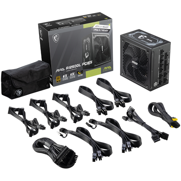 MSI MAG A1250GL PCIE5 Power Supply 1250W, 80 PLUS Gold, 135 mm Fan Size, Protections: OCP/OVP/OPP/OTP/SCP/UVP, Active PFC Design, Flat Cable Equipment, Dimensions: 150mmx150mmx86mm, 5Y Warranty