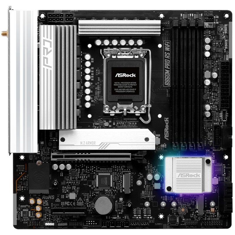ASROCK MB Desktop B860M Pro Rs Wi-fi, S.1851, 4x DDR5, 1x PCIe 5.0 x16, 1x PCIe 4.0 x4, 1x Blazing M.2, 2x Hyper M.2, 4x SATA3, 2x USB-C, 8x USB 3.2, 6x USB 2.0, 1x RJ-45 2.5GB Lan, 802.11axe Wi-Fi 6E + Bluetooth 5.3, ATX