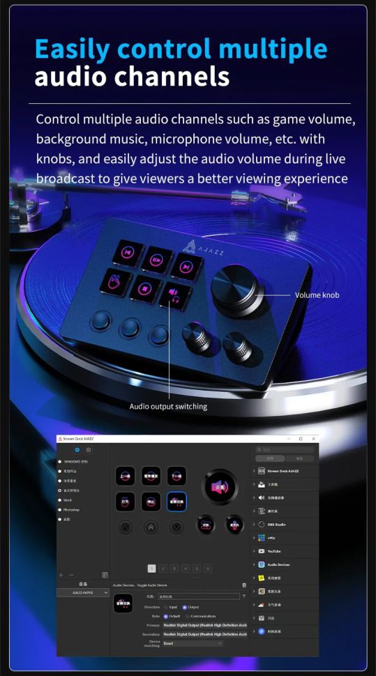 Audio Control: Knobs can control multiple audio parameters (e.g., master volume, mic volume) if configured
