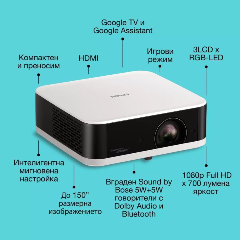 Други:Google TV and Google Assistant, Auto power on, Auto shape correction, Auto source search, Auto keystone correction, Built-in speaker, Chromecast, Digital zoom, Fit to Screen, Frame-Interpolation, Game mode, Google TV, Quick Corner, Screen fit, 2D Colou...