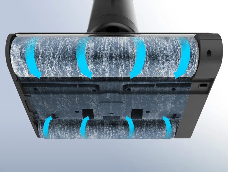 Нашата глава на четката е специално проектирана да приляга към ъглите и да събира мръсотията от труднодостъпните места. Благодарение на малката ръбова ролка трансформаторът може лесно да почиства покрай подовеите первази