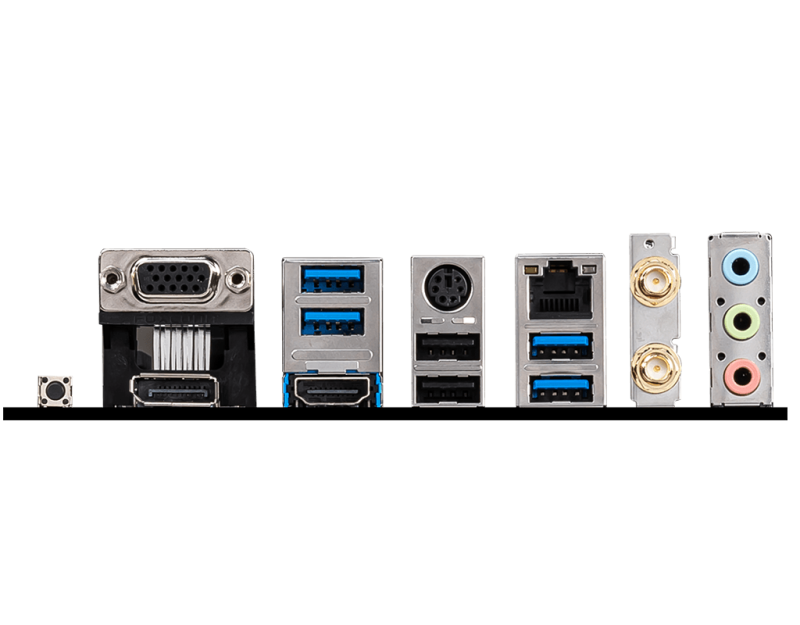 :VGA; USB 3.2 Gen 1 5Gbps Type-A; Keyboard / Mouse; LAN; Flash BIOS Button; DisplayPort; HDMI; USB 2.0; USB 3.2 Gen 1 5Gbps Type-A; Wi-Fi Antenna connectors; 3x Audio jacks