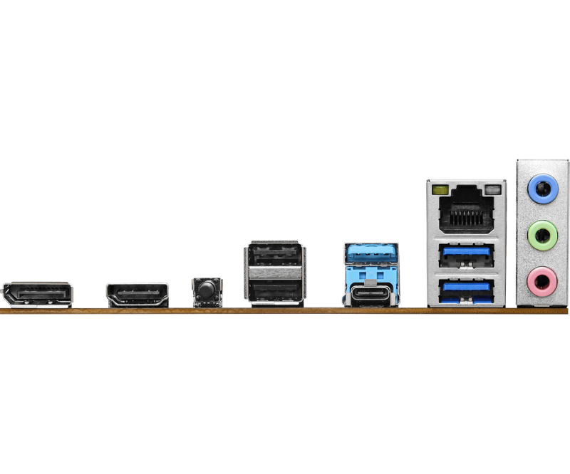 :- 2 x Antenna Mounting Points; - 1 x HDMI Port; - 1 x DisplayPort 1.4; - 1 x USB 3.2 Gen1 Type-C Port; - 3 x USB 3.2 Gen1 Type-A Ports; - 2 x USB 2.0 Ports; - 1 x RJ-45 LAN Port; - 1 x BIOS Flashback Button; - HD Audio Jacks: Line in / Front Speaker /...