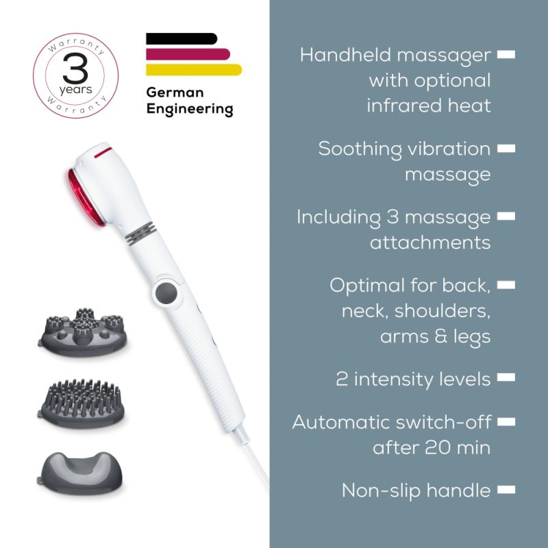 Others:2-in-1: Massager with optional infrared heat; Optimal for the back, neck, shoulders, arms, and legs; 180 degree rotating massage head and an adjustable handle with 3 positions for flexible usage