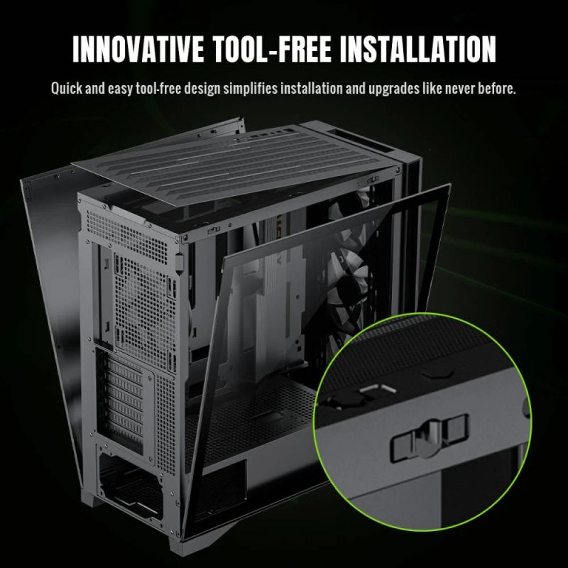 Incorporates a tool-free design, vertical GPU support, and hidden cable routing with a detachable cover